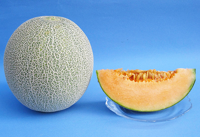 果肉が赤肉のネット系メロン。果皮は灰緑色で細かい網目が全体を覆い、果肉はオレンジ色で緻密。糖度が15~17度ほどと高く、果汁を多く含んでいて口当たりがよいメロンです。日持ちもよいほうで食味も安定していることから、長年にわたり赤肉メロンの代表品種として定着しています。